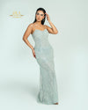 Das gesamte Kleid ist überzogen mit einem geometrisch inspirierten Muster aus feinsten Mikro-Pailletten, die vertikal arrangiert wurden, um die Figur optisch zu verlängern und in Bewegung ein hypnotisches Lichtspiel zu erzeugen. Eingestreut finden sich hochwertige Kristallelemente, die selektiv platziert wurden – wie Sterne auf klarer Oberfläche.